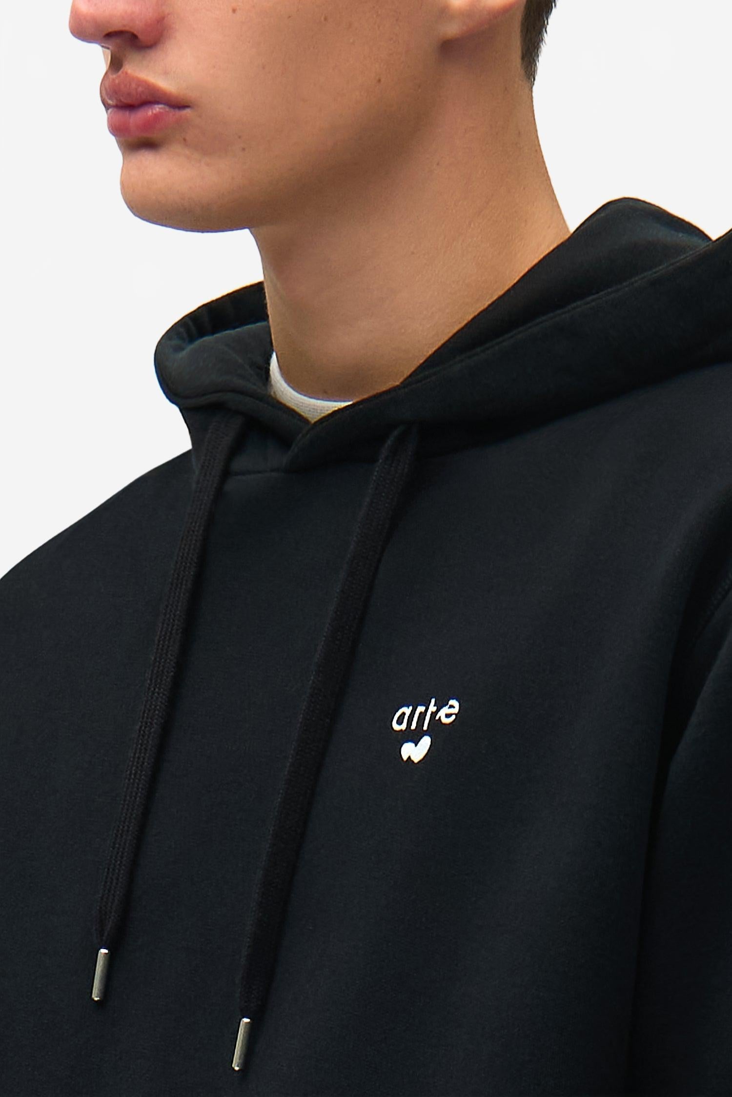 Ce sweat à capuche arbore une version déformée et saisonnière du logo Arte en forme de cœur, délicatement brodée en blanc sur la poitrine gauche.